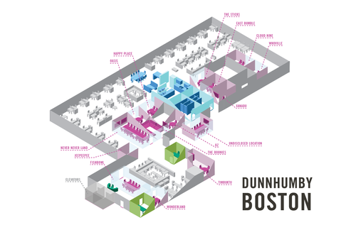 An exploration of isometric illustration using the Dunnhumby Boston office and its creatively named conference rooms as inspiration, designed for display within the office itself.