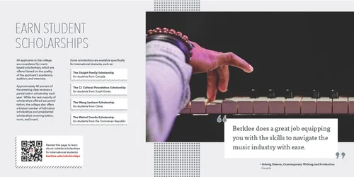 Layout for an informational booklet utilizing the design language established by the Berklee College of Music undergraduate viewbook (designed by PopKitchen), but with condensed information geared toward the international audience. Click here to view a high-quality PDF.